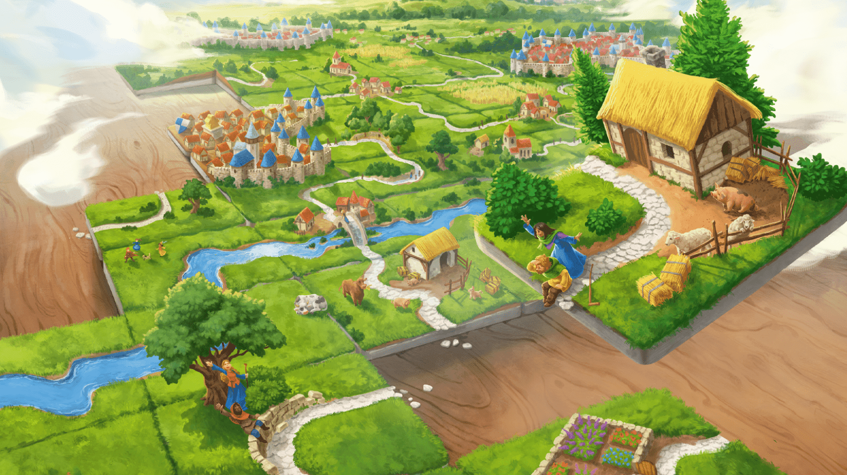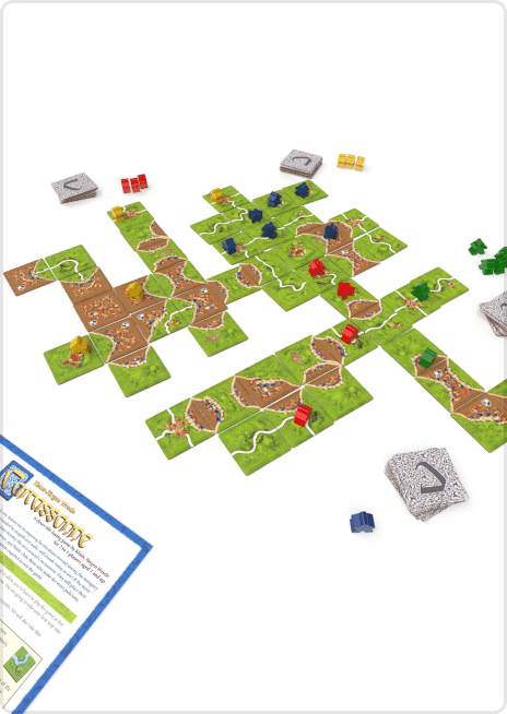 Players choose from tiles that depict cities, roads, monasteries, and fields; each new tile placed creates an ever-expanding board on which players can then add their followers.