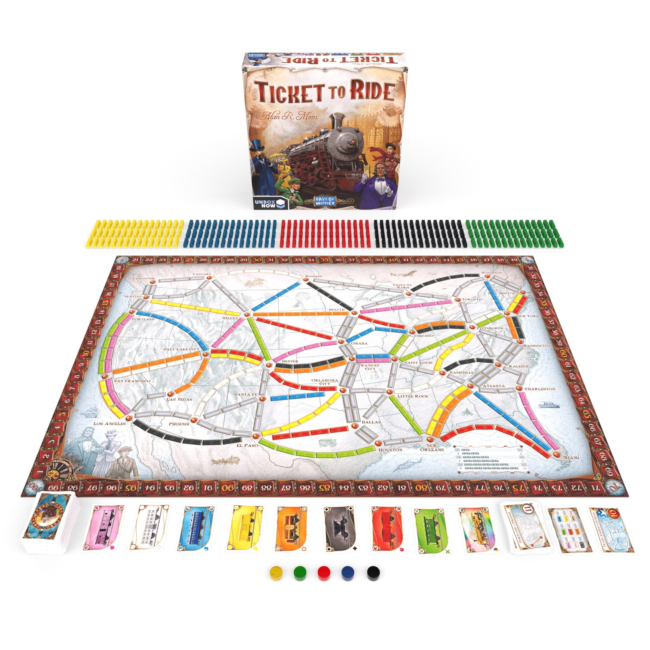 Ticket to Ride è un’avventura in treno in cui i giocatori competono tra loro per collegare le città contendendosi il controllo delle linee sulla mappa del Nord America. Completa gli obiettivi tenendo d’occhio le linee degli avversari! Tutti a bordo!